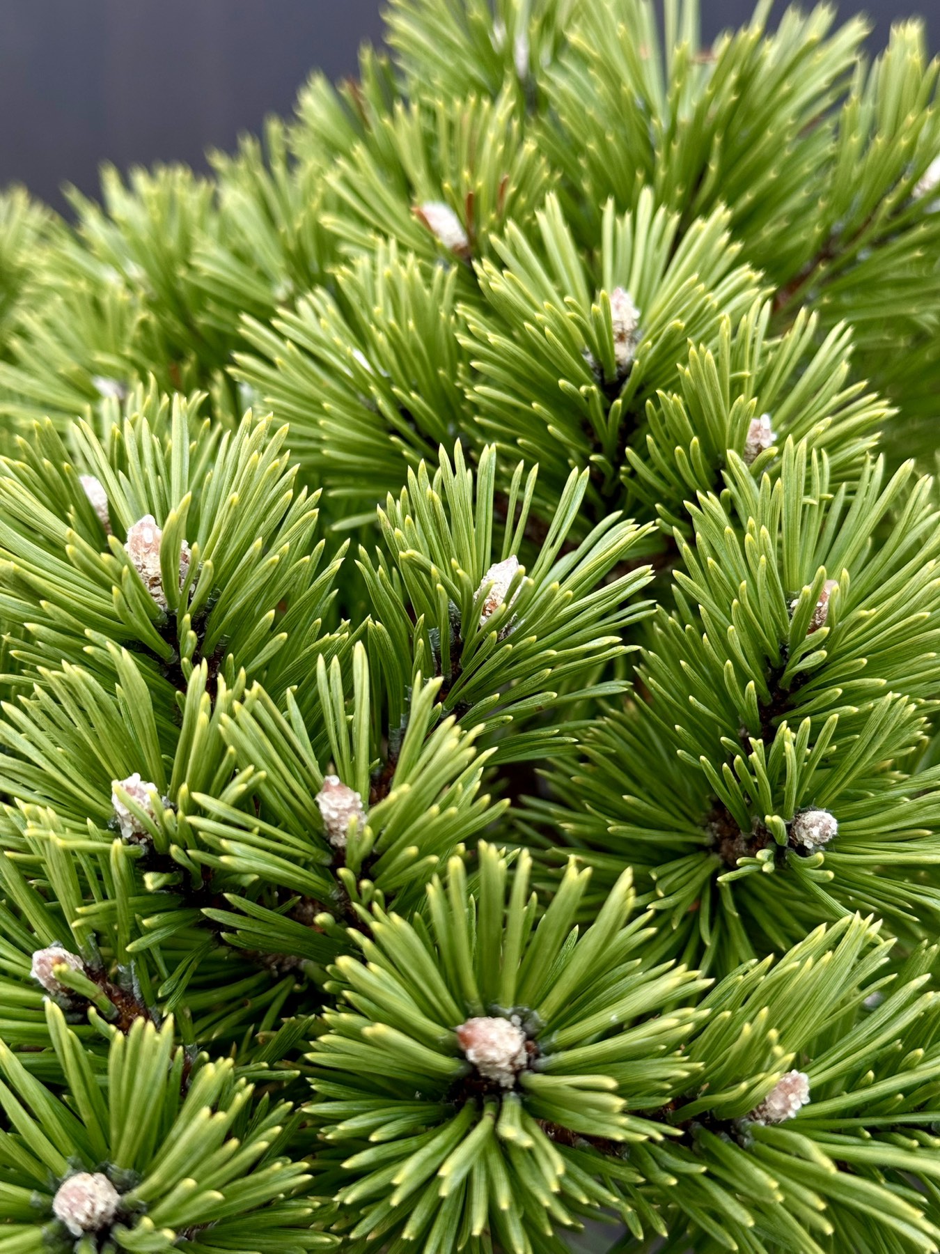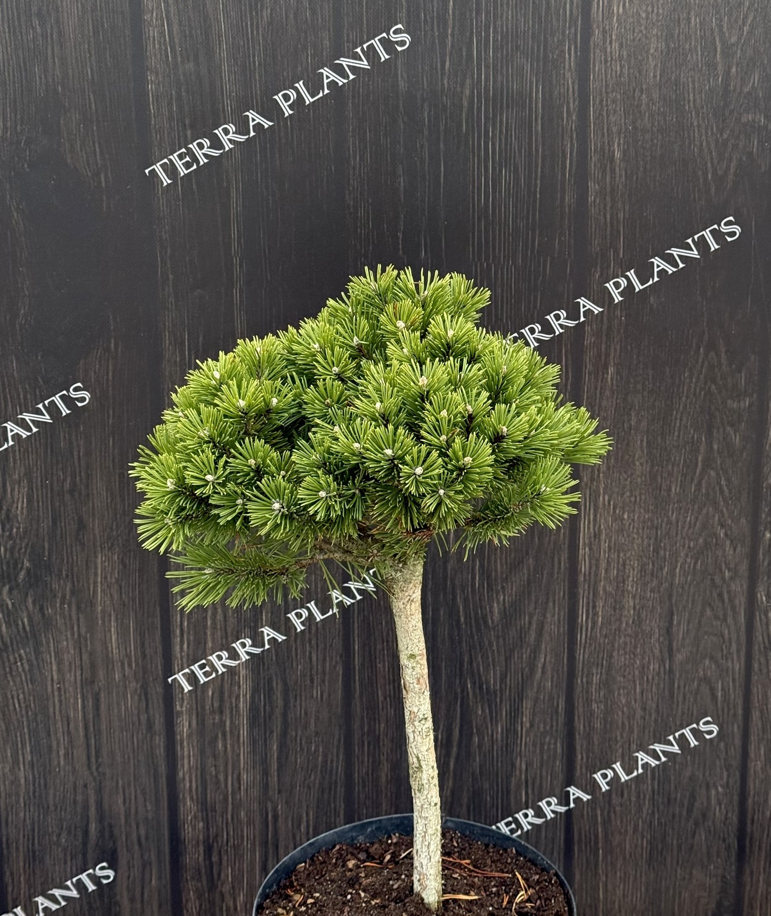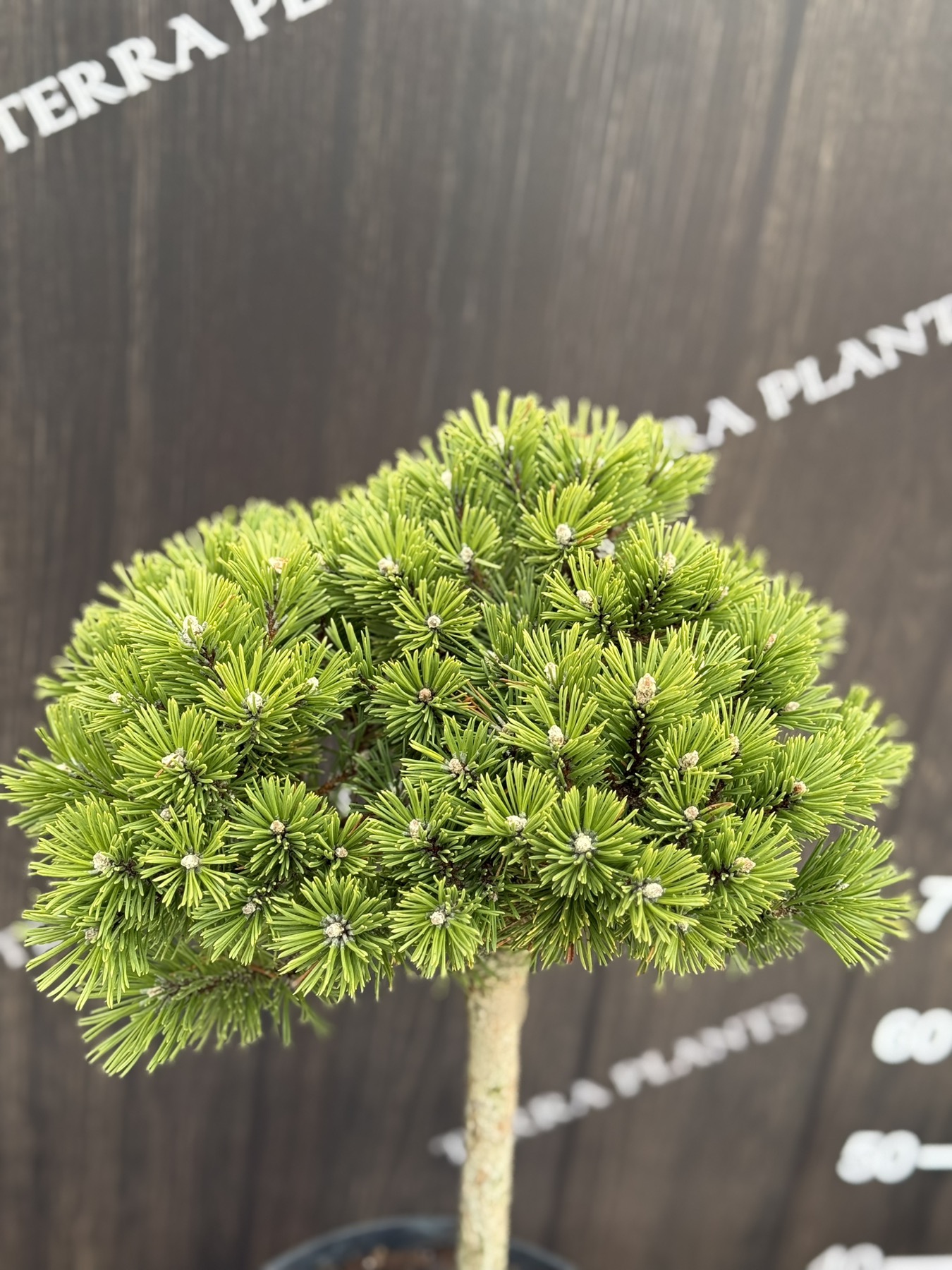 Сосна гірська ‘Benjamin’ на штамбі -вишукана карликова форма, що поєднує природну красу хвойного дерева з декоративністю садового бонсая. Її щільна крона утворює акуратну кулясту форму, яка виглядає ефектно протягом усього року. Хвоя коротка, густо-зелена, зберігає насичений колір навіть узимку.