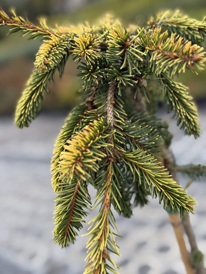 Ялина штамбова Gold Drift – декоративна ялина із плакучою формою крони та яскравою золотистою хвоєю. Ефектна штамбова форма ялини звичайної, пагони якої звисають донизу, утворюючи золотий “водоспад”. Навесні хвоя має насичений лимонно-жовтий відтінок, влітку стає зелено-золотою, зберігаючи привабливий вигляд протягом усього сезону. Найкраще росте на сонячних місцях, у затінку колір хвої стає менш інтенсивним. Віддає перевагу родючим, помірно вологим, добре дренованим ґрунтам із нейтральною або слабо кислою реакцією. Морозостійка, невибаглива, легко переносить формувальну обрізку.