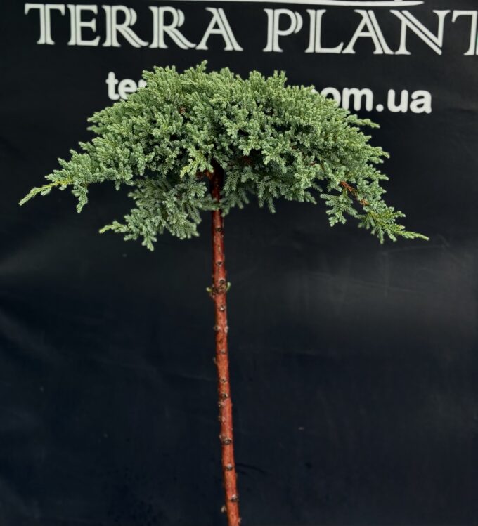 Mini Blue Carpet у штамбовій формі – це вибір для тих, хто хоче підкреслити стиль та оригінальність свого саду, надавши йому сучасного та елегантного вигляду. Завдяки щепленню на ніжку він виглядає як невеличке деревце з каскадною кроною, що спадає вниз красивим “блакитним водоспадом”.