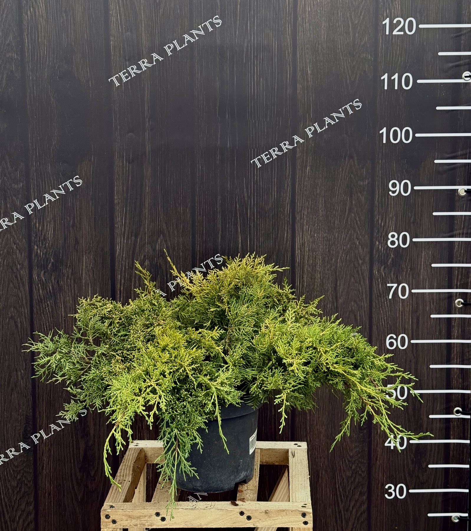 Один з кращих представників золотистих ялівців, сорт селекції дев’яностих, компактний і дуже витончений. Невисокий декоративний хвойний кущ з щільною розкидистою кроною, що розташована горизонтальними ярусами. У віці 10 років досягає 0,5 м висоти при діаметрі 1,5 м. Максимальна висота 1 м, при діаметрі 2 м. Пагони горизонтально розташовані, густі, валикоподібні з елегантно опущеними кінчиками пагони. У період росту мають особливо яскраве жовте забарвлення, пізніше пагони темніють. М’яка луската хвоя у основи гілок стає голковидною, колючою, зеленувато-жовта або золотисто-жовта, взимку темніє. Вимоги: вимоги до грунту і вологи не високі. Віддає перевагу сонячним місцям і добре дренованим родючім грунтам. Морозостійкий. Віддає перевагу добре освітленим місцям, в тіні розвивається погано.