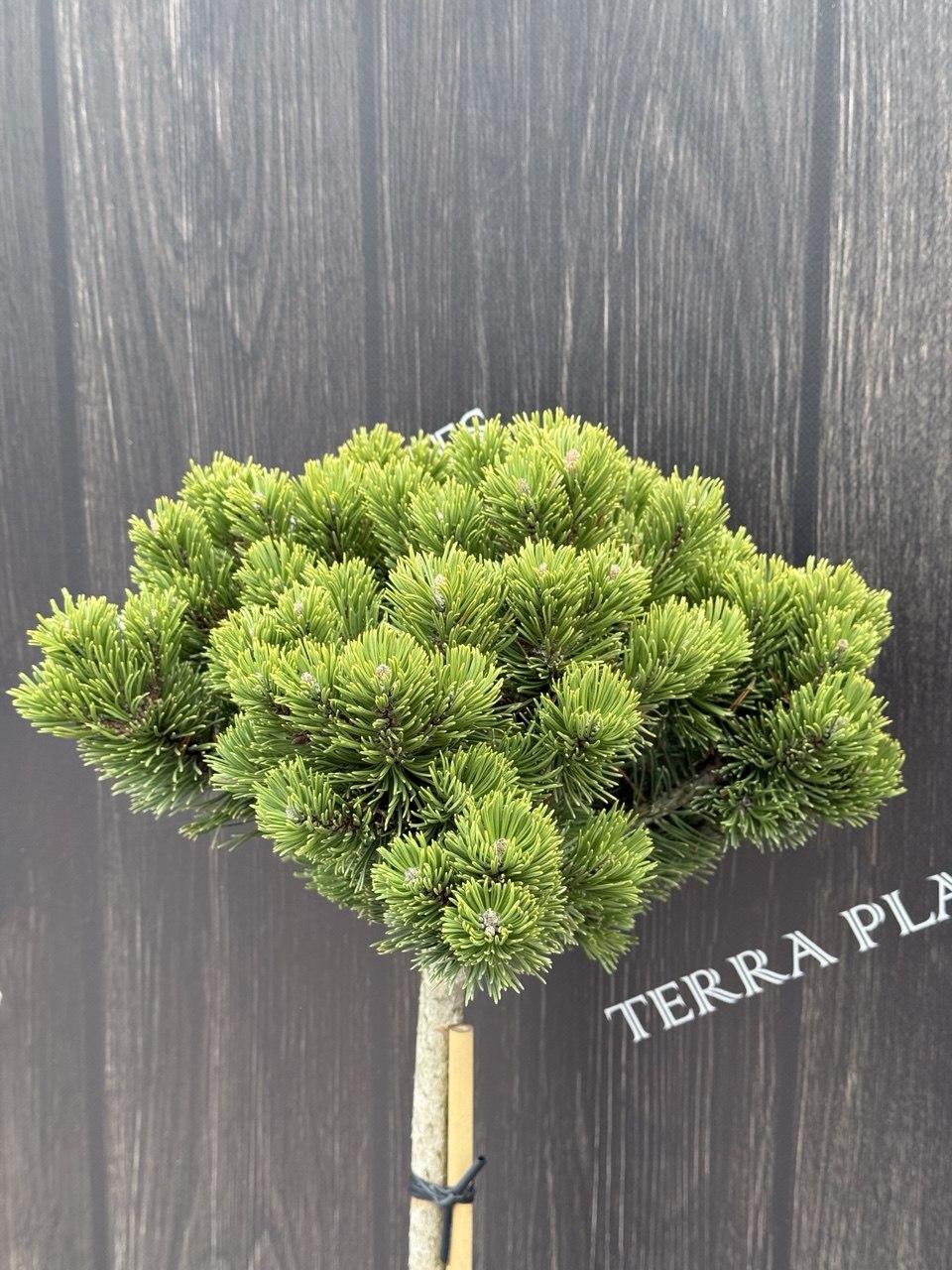Декоративна штамбова форма гірської сосни з компактною, щільною кулястою кроною. Завдяки правильній формі та повільному росту рослина виглядає акуратно без регулярної обрізки й ідеально підходить для сучасних садів, невеликих ділянок і контейнерного озеленення.